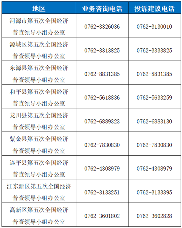 河源市和下辖县(市、区)第五次全国 经济普查办公室对外联系电话